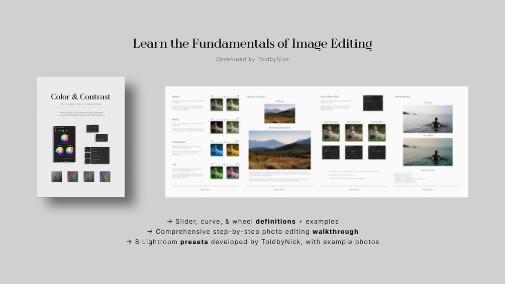 That's why I developed Color & Contrast: The Fundamentals of Image Editing. Paired with my TbN Presets pack, this is a Lightroom Accelerator Kit that covers nearly every photo post-processing tool, from basic sliders, to more advanced masking and grading techniques (though, these lessons apply to all image-editing softwares).